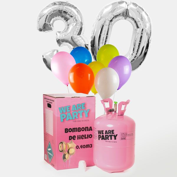 Un completo pack para decorar tu fiesta de cumpleaños o aniversario que incluye una bombona de helio Maxi de 0,42m3, más 2 globos foil con forma de número de 86cm/34" de alto color plata y una bolsa de 30 globos de látex de 28cm/11"Ø de colores surtidos. Y 50m de cinta blanca para atarlos de regalo.